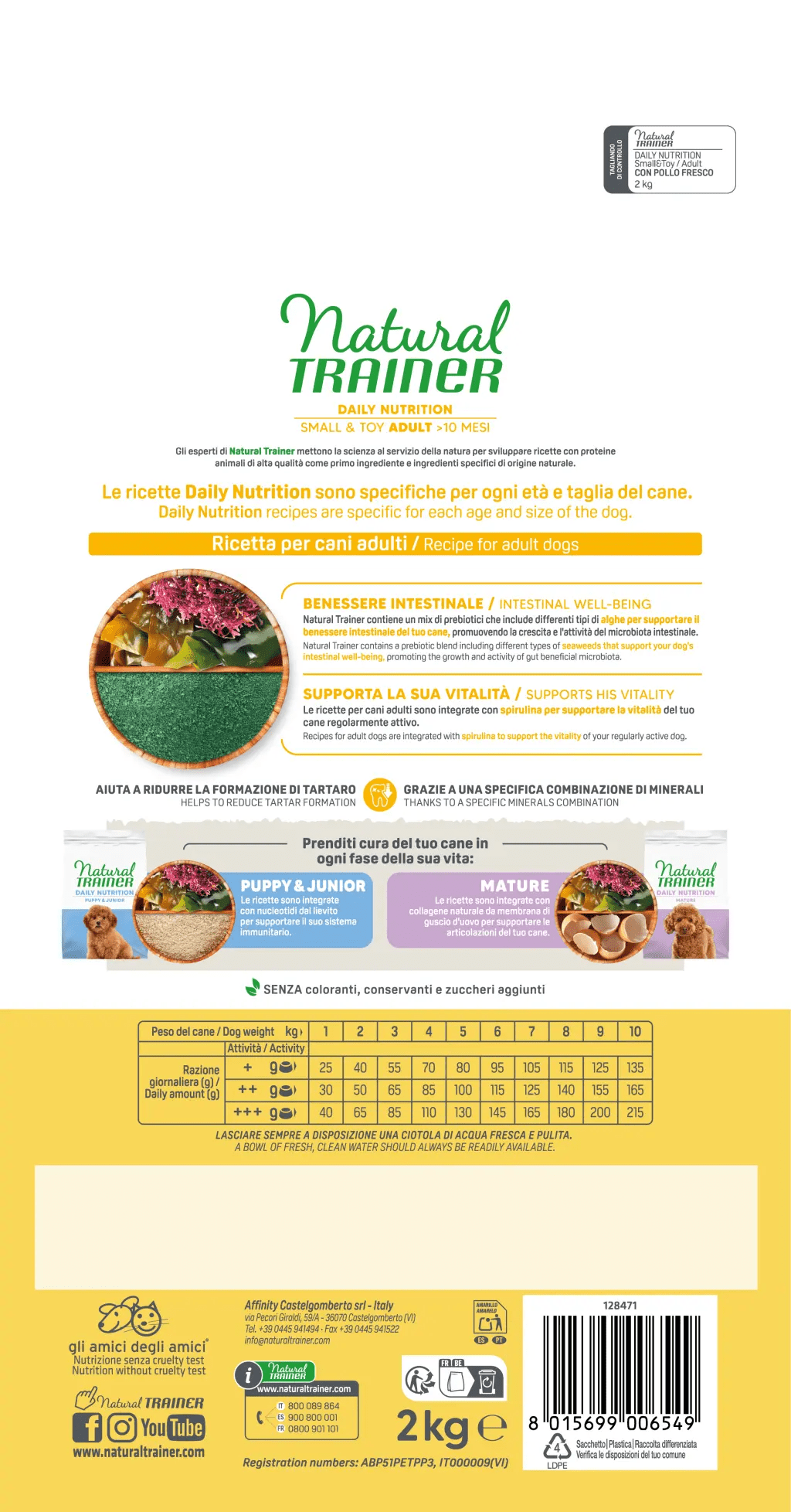 Proteine disidratate di pollo e tacchino 18%, granturco*, pollo fresco*, fioretto di granturco*, grasso animale (grasso di pollame*, strutto*), orzo*, piselli disidratati*, proteina di granturco, tonno* 4%, riso* 4%, proteine animali idrolizzate (pollame, maiale, pesce), semi di lino*, polpa di barbabietola*, proteine disidratate di tonno, olio di granturco, sostanze minerali (esametafosfato di sodio 0,6%), macroalghe (Ulva lactuca, Ascophyllum nodosum, Gracilaria spp)* 0,38%, concentrato secco di radice di cicoria (fonte di inulina)* 0,2%, spirulina (Arthrospira platensis)* 0,1%. *Ingredienti naturali.